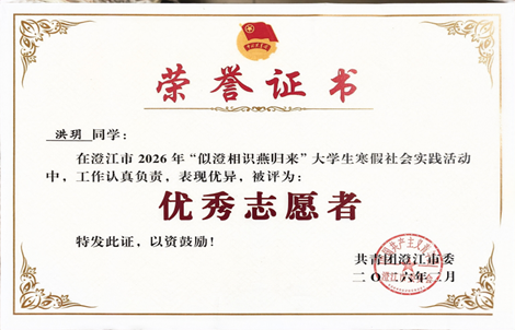 实践事迹:洪玥主动投身寒假“返家乡”志愿实践,担任场景布置与活动视频拍摄岗志愿者,全程负责新春场景氛围营造与活动影像记录工作。打磨场景搭建细节,精准把控镜头语言与画面质感,用鲜活影像定格家乡新春烟火气,传递浓浓年味与人间温情。