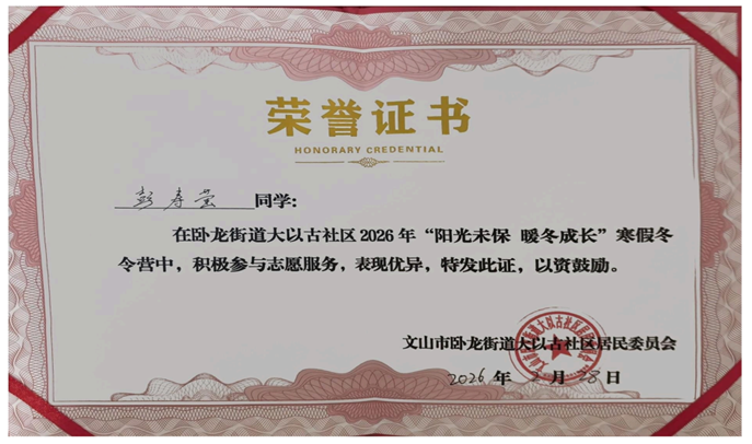 实践事迹:加入社区“阳光未保 暖冬成长”冬令营志愿队伍,化身活动带领者与孩子们的“大朋友”,设计实施两期特色课程,创新“分层引导”教学法适配不同年级孩子,将自护教育、传统民俗知识转化为趣味体验,让孩子们在玩乐中收获成长。
