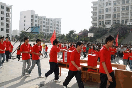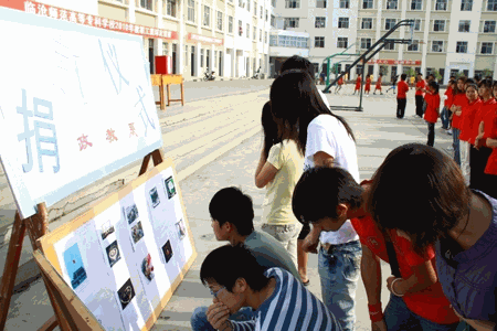 在新篮球场上,政教系师生身着红色T恤组成了“玉树”二字。同学们首先参观了玉树地震灾情文字和图片介绍,接着向玉树遇难同胞默哀三分钟,寄托哀思;在郭镛教授的带领下,政教系师生和各系学生代表慷慨解囊,向玉树灾情捐款,献上自己的一份爱心。