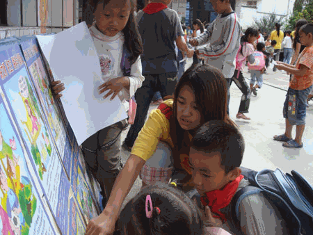 本次活动以宣传《中华人民共和国未成年人保护法》、《中华人民共和国义务教育法》为主要内容。活动前,我校广大志愿者花费了大量的业余时间制作内容丰富的展板,并为每幅展板配上生动形象的漫画。活动过程中,志愿者生动的讲解、形式活泼的展演形式深深地吸引了同学们,激发了他们浓厚的兴趣,同学们听得津津有味。他们认真地看着每一幅图画,仔细聆听志愿者们的讲解,不时向志愿者提出问题。整个宣传活动气氛热烈,志愿者与学生之间互动良好。