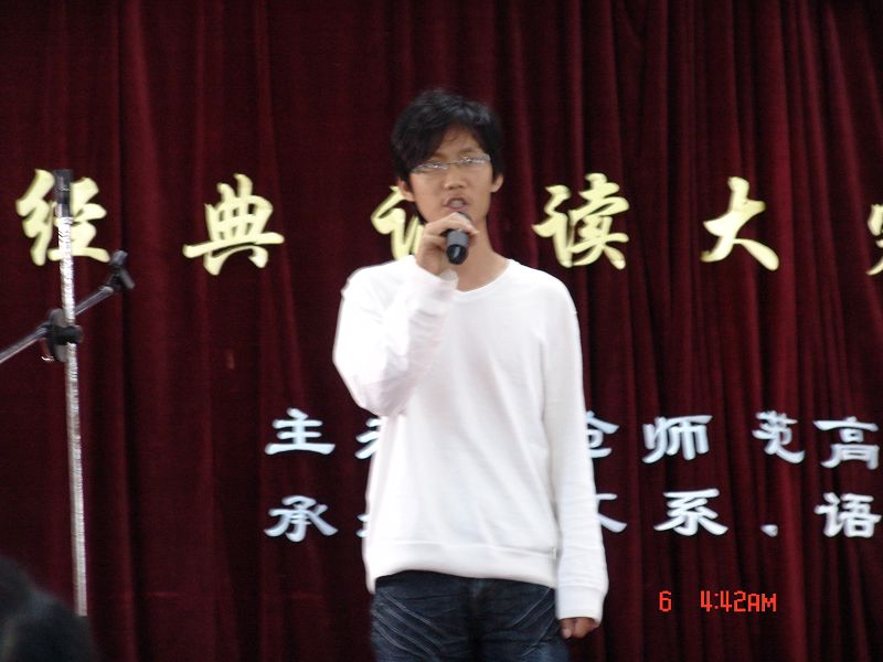 (党委宣传部文/张玉超图/陈奇云)2008年11月6日16时,粉紫气球装饰的老电教楼舞台,温馨而生动,中华经典诵读大赛决赛于此时此地撩开了让人倍感期待的面纱,三百多的观众品尝了这次风味十足的文化盛宴。