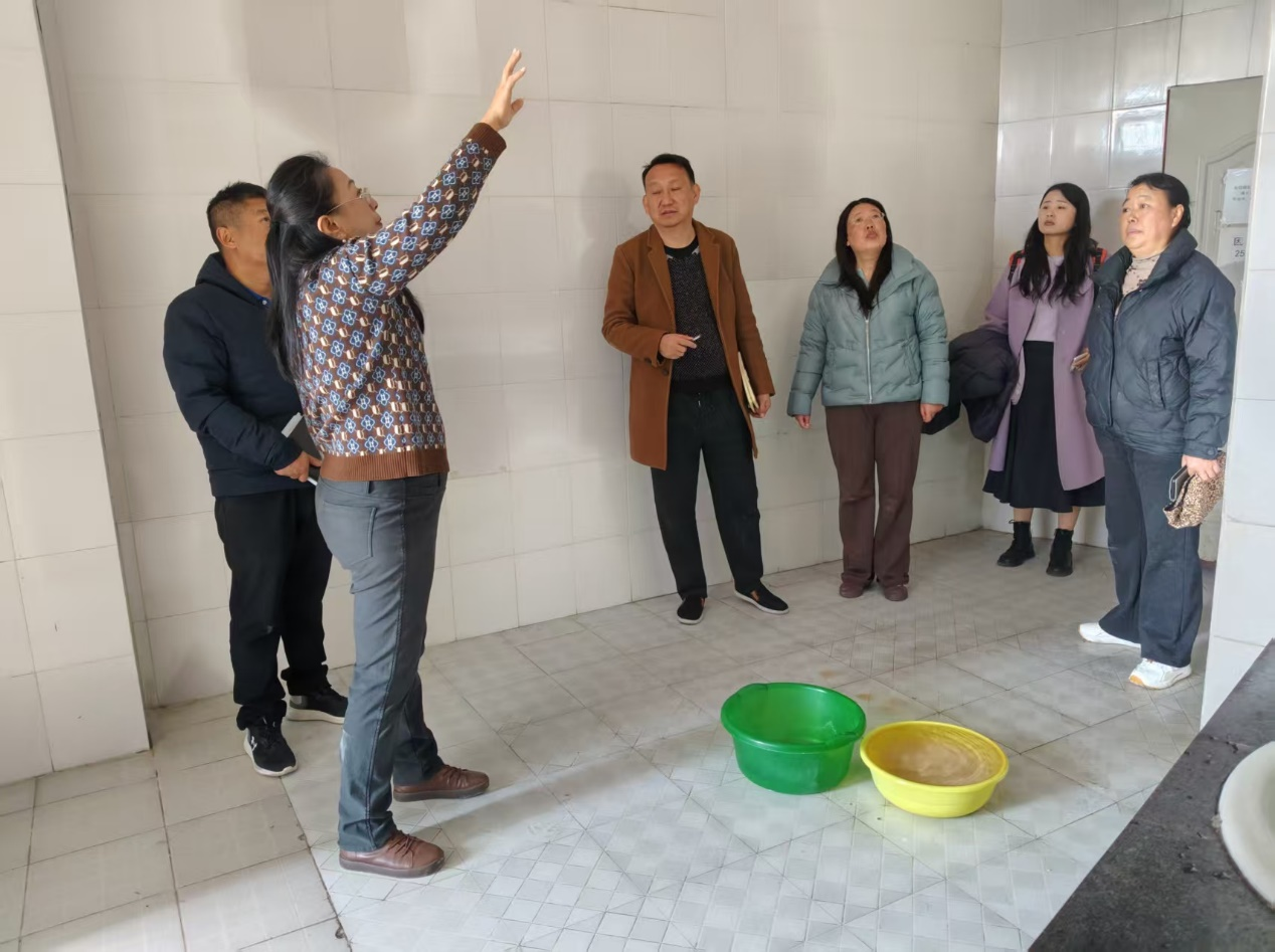 检查组严格遵循“不放过一处隐患、不漏过一个细节”的工作原则,对图书馆各楼层阅览区、卫生设施、四楼平台及公共空间进行全面细致排查。重点围绕建筑结构安全性能、设施设备运行状态、消防系统保障能力等方面展开检查。经检查发现,图书馆存在以下安全隐患:卫生设施普遍存在管道渗漏及地面积水问题;四楼平台排水系统效能不畅,雨季积水问题严重并导致建筑渗透;多处公共区域墙面出现空鼓、开裂及饰面脱落等结构性缺陷,存在高空坠物风险。刘艳红详细询问情况、分析成因,并要求责任部门立即记录、限期溯源、彻底整改。