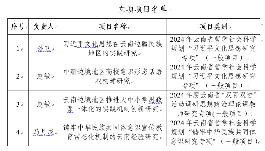 近期,中共云南省委宣传部陆续下发项目立项通知,学校获立项4项,其中,立项2024年云南省哲学社会科学规划“习近平文化思想研究专项”2项,立项2024年度云南省“双百双进”活动调研思想政治理论课教师研究专项1项,立项2024年云南省哲学社会科学规划“铸牢中华民族共同体意识研究专项”1项。