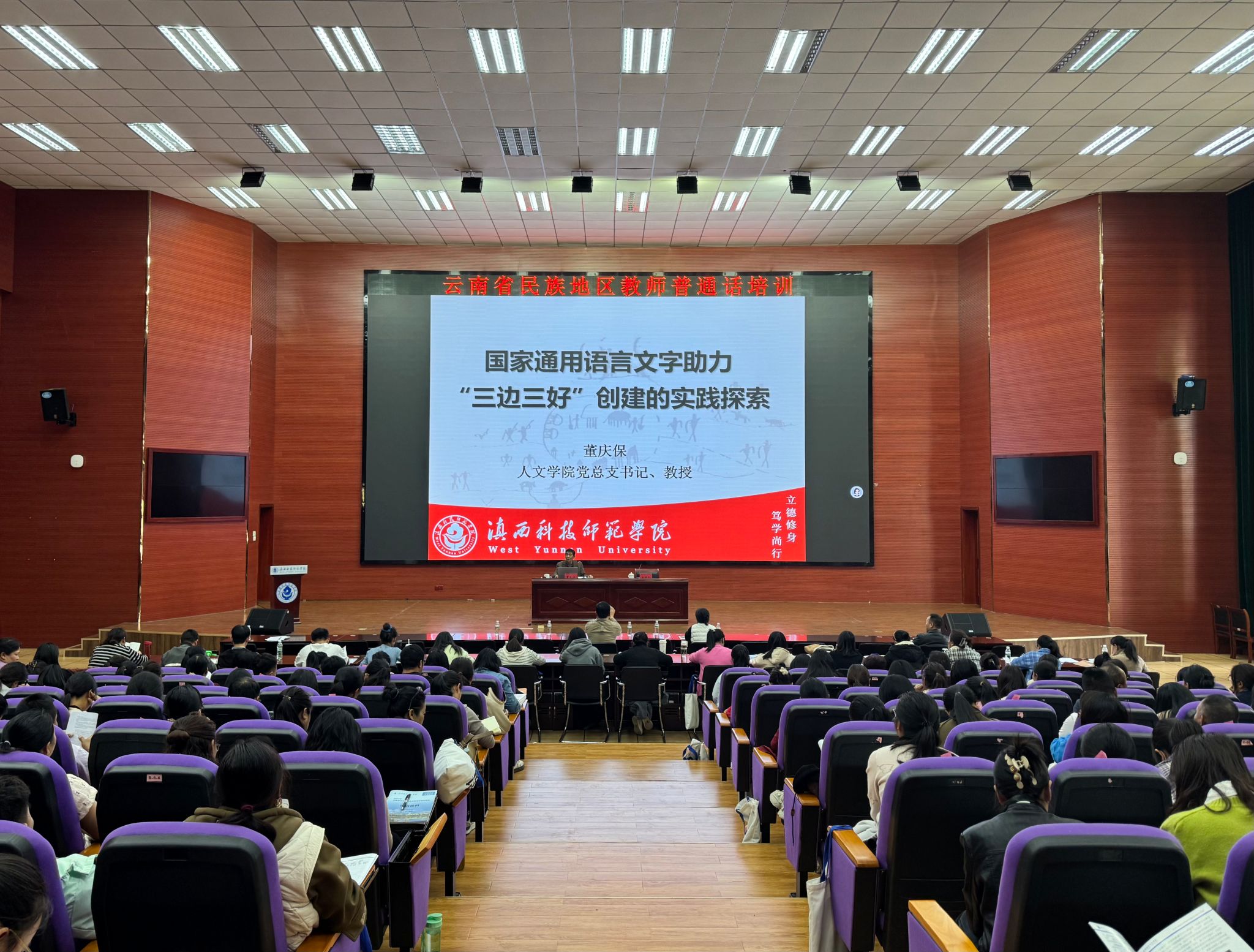 2月24日,人文学院党总支书记董庆保教授以“国家通用语言文字助力‘三边三好’创建的实践探索”为题,为2024年云南省民族地区教师普通话培训班参训学员作专题辅导。